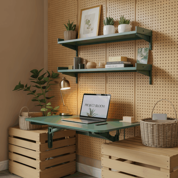 - A wall-mounted fold-down desk (Murphy-style desk) is perfect for multipurpose rooms.