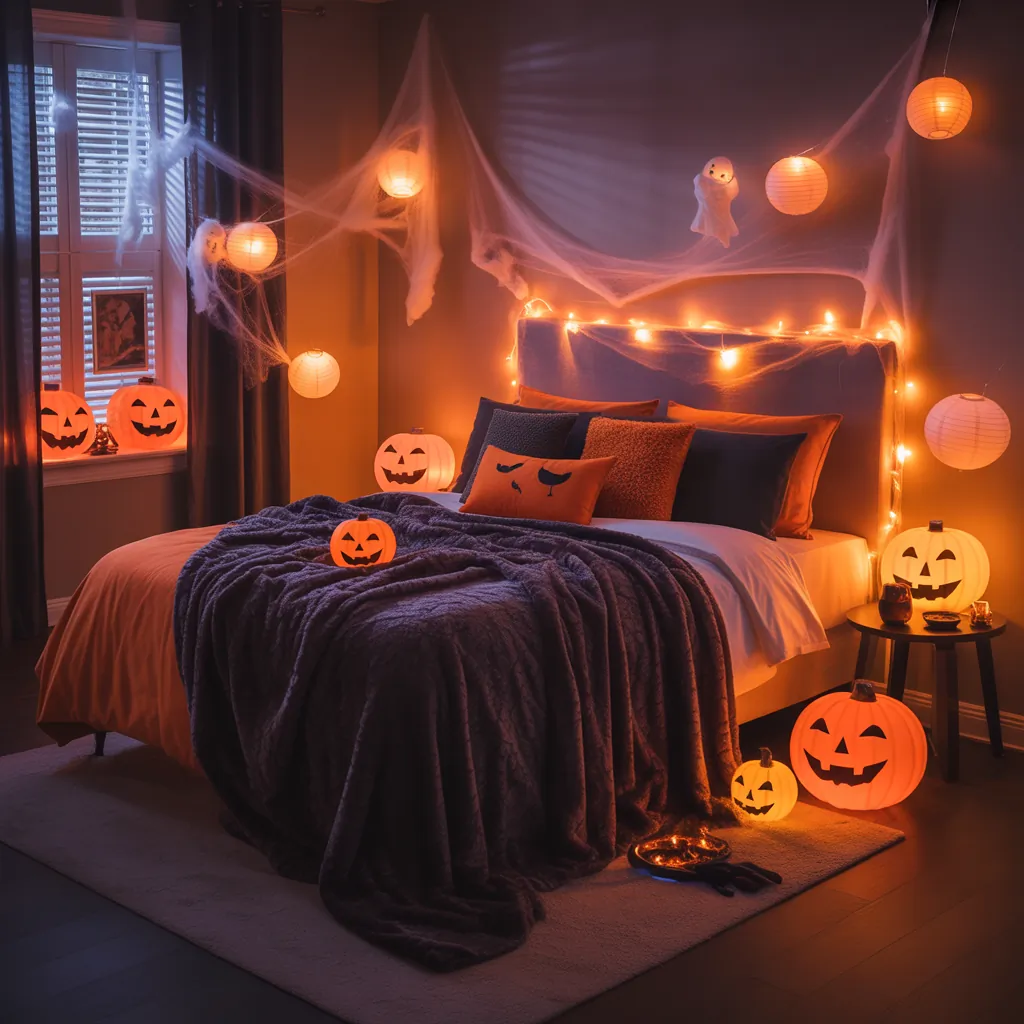 Lighting is everything when it comes to Halloween bedroom decor. Swap out harsh ceiling lights for dim, ambient lighting. Use string lights in orange, purple, or spooky shades to add a warm, eerie glow. Candles (real or flameless for safety) enhance the haunted effect—think black candlesticks or lanterns.