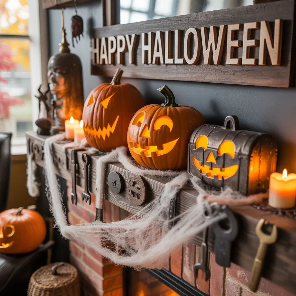 If you’re decorating for kids or love a more lighthearted vibe, opt for whimsical elements like pumpkins with funny faces, ghost figurines, and colorful string lights. Incorporate playful banners or mini Halloween-themed plush toys that bring charm and cheer to your mantle.