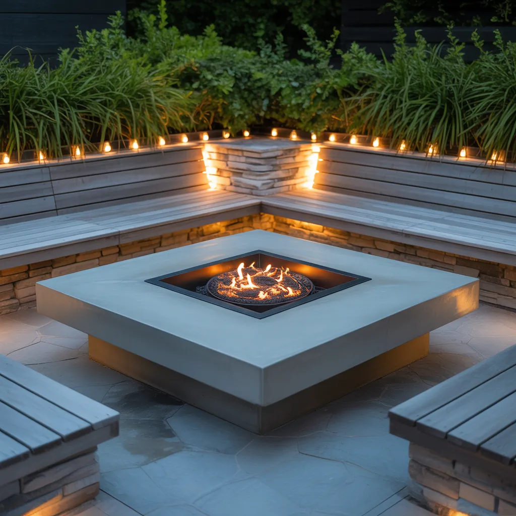 - Plan seating: Corner benches or an L-shaped built-in work perfectly with a square pit — leave a 36–48″ clearance for comfort and safety.