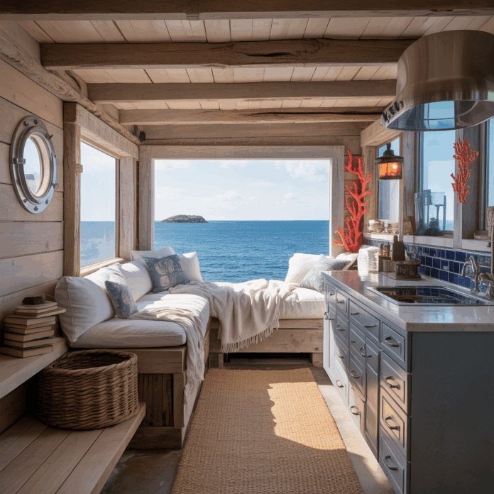 Stick to muted, natural tones: driftwood grays, sand beiges, deep-sea blues, and olive greens. Accent with rope, woven baskets, hammered metal lamps, and simple ceramics to keep the space feeling both handcrafted and comfortable.