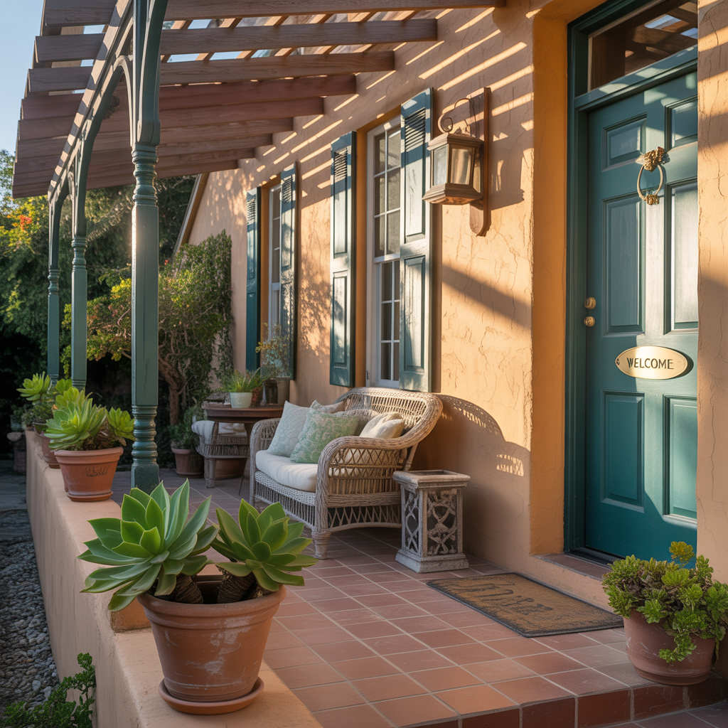 Warm, earthy tones, arched openings, and decorative ironwork pair perfectly with a sand-textured stucco finish. Add clay pots, a patterned tile riser on the steps, and a rustic wooden door for instant authenticity.