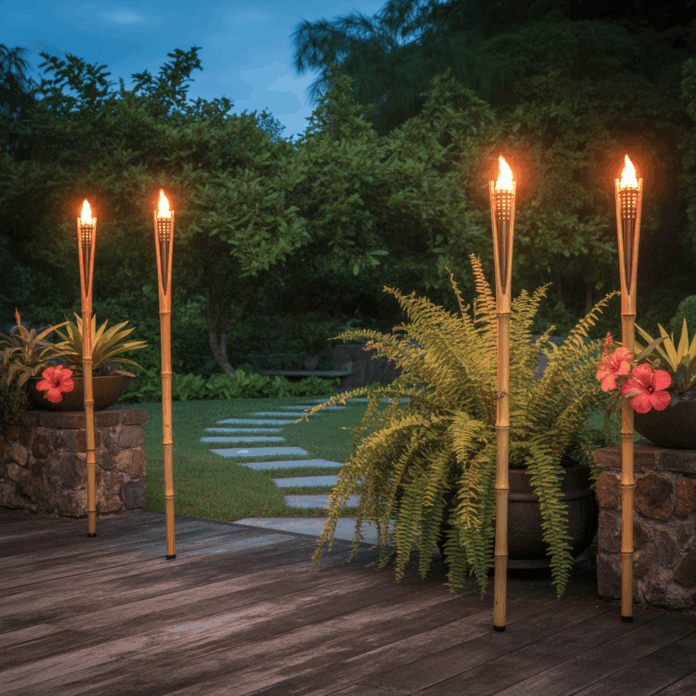 - Mix materials: combine bamboo torches with metal lanterns or string lights for a curated look.