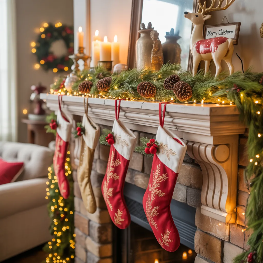 For a cozy, rustic vibe, opt for natural elements like pinecones, burlap ribbons, and wooden accents. Layer a burlap runner across the mantle, add clusters of pine branches, and incorporate candle lanterns. This style creates a warm and inviting atmosphere perfect for a family-oriented celebration.