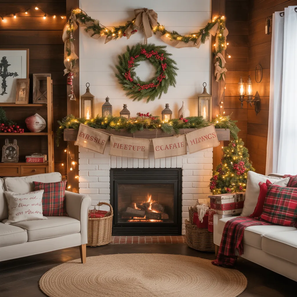 Adorn your fireplace mantel with vintage lanterns, garlands made of natural greenery, and cotton stems for added texture. Incorporate antique candleholders and rustic figurines for a truly charming farmhouse holiday display.