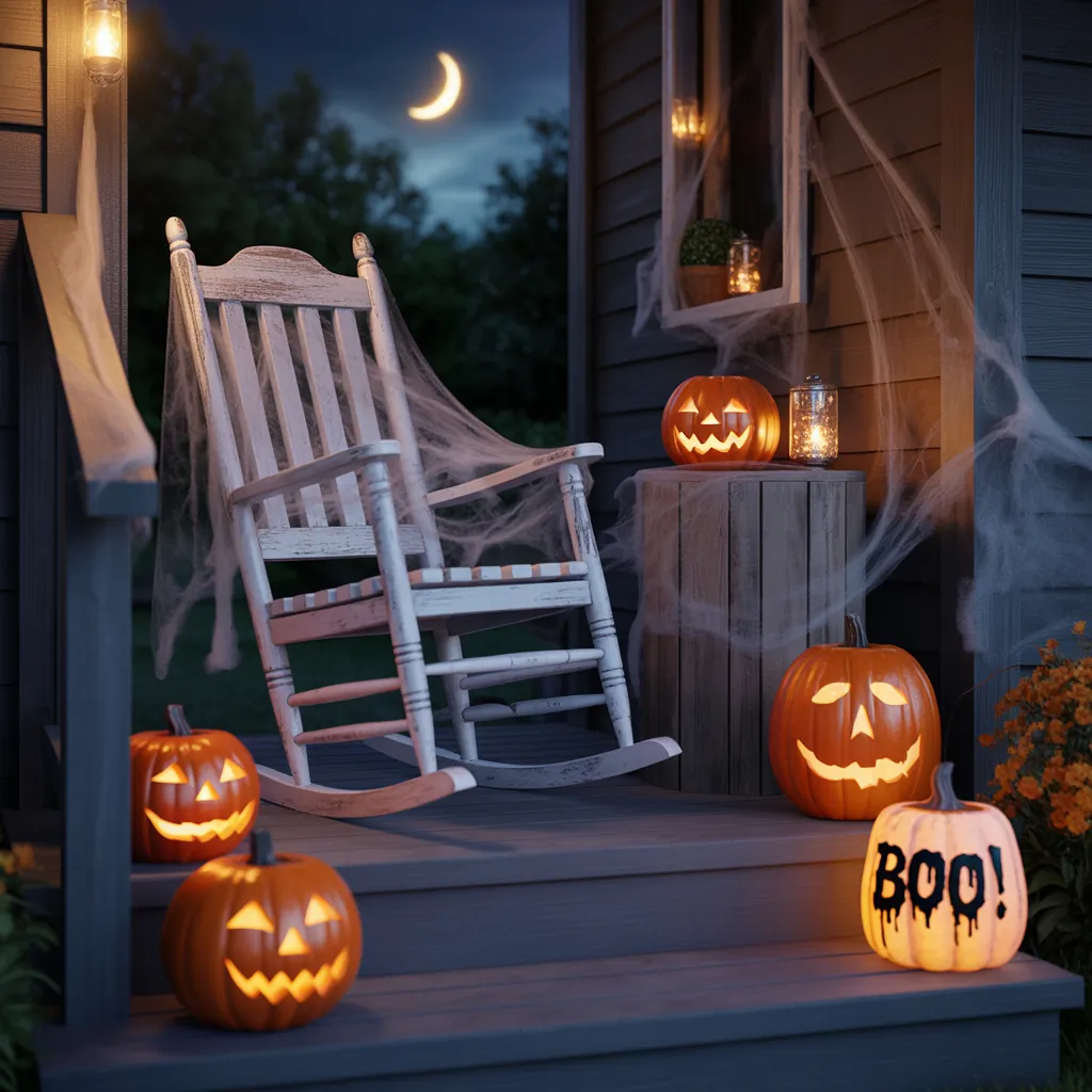 Choosing a theme can make your front porch stand out. Think haunted forest with faux trees and ghostly lighting, vintage Victorian horror with antique lanterns and lace accents, or modern minimalist with monochrome black and white decor. Incorporate themed pumpkins, spooky banners, and eerie props that align with your chosen vibe for a cohesive and eye-catching display. For inspiration, explore our [Halloween decor ideas] section, packed with creative themes for every style.