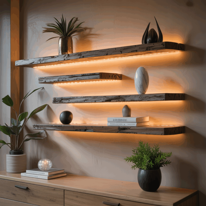 Incorporate LED strip lights under your floating shelves to highlight your decor items or create ambient mood lighting. This modern twist can turn your shelves into a focal point, especially in media rooms or bedrooms.