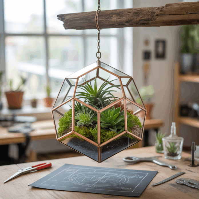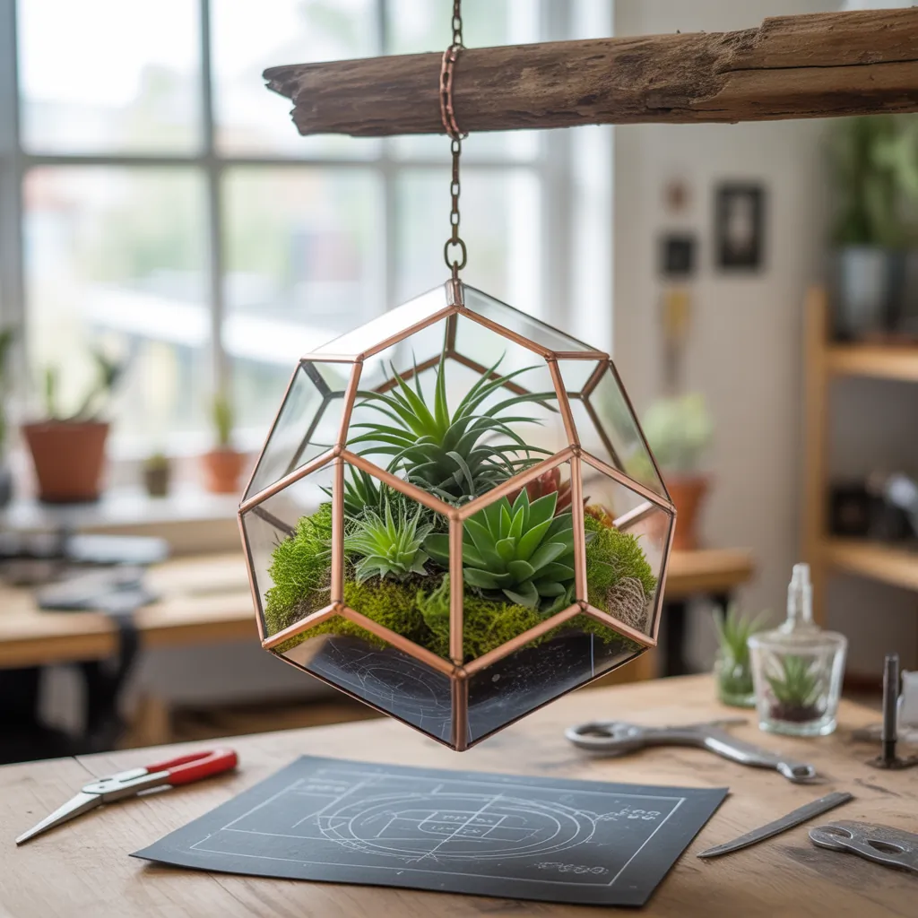 - Modern Geometric: Copper or brass-framed geometric terrariums with succulents for an industrial-chic look.