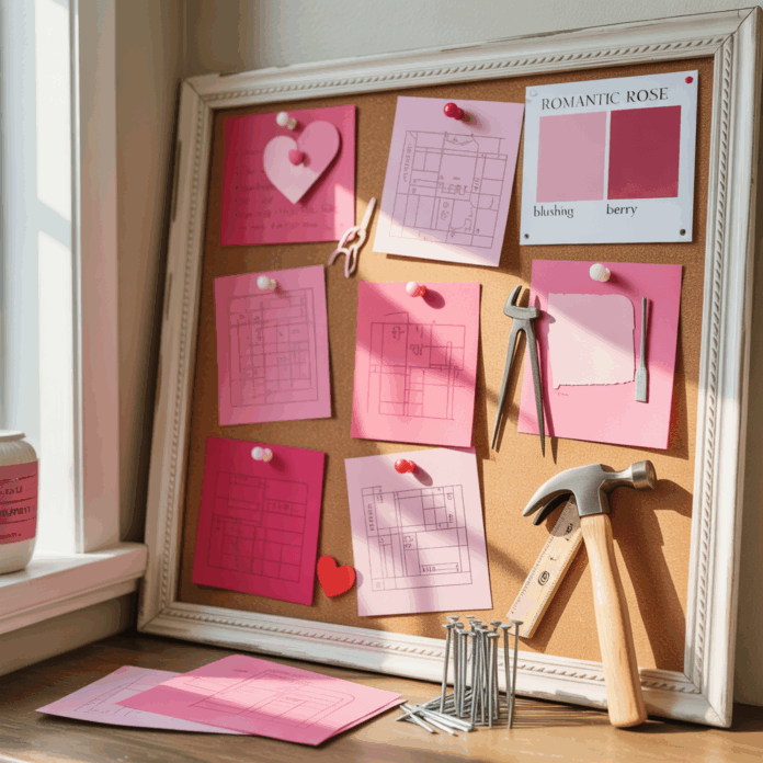 A: Start with a board (cork or felt), background paper or fabric, scissors, adhesive (push pins, hot glue, or double-sided tape), and accent pieces like paper hearts, ribbon, and letter cutouts. Most basic boards can be completed with items you already own.