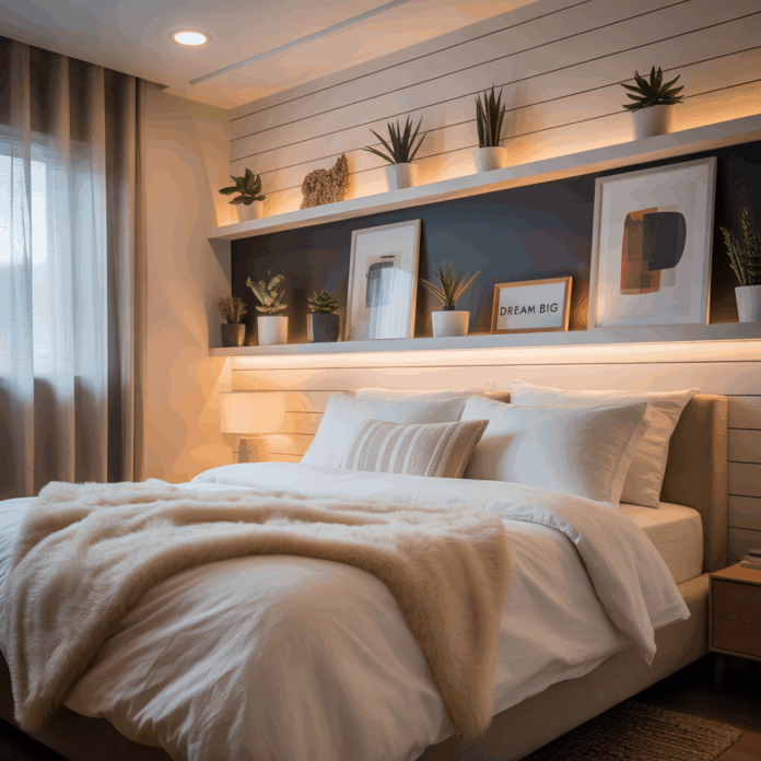- Why it works: Adds storage and display space while framing the bed. Integrates bedside lighting for a clean look.