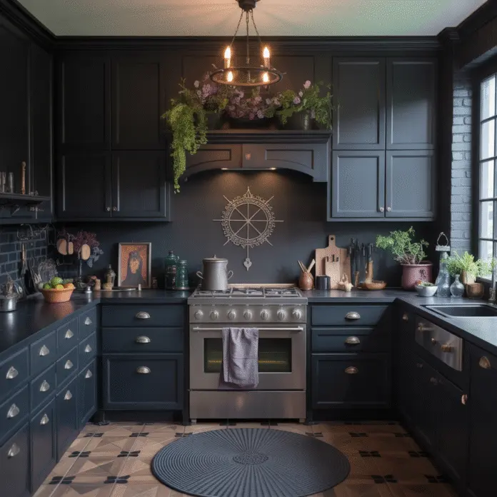 Decorate with enchanting elements like vintage apothecary jars, tarot card-inspired art, and mystical symbols. Think about adding a chandelier with a gothic flair or vintage brass pot racks that double as statement pieces. A few well-placed crystals or a small altar with candles can add serious witchy charm without overwhelming the space.