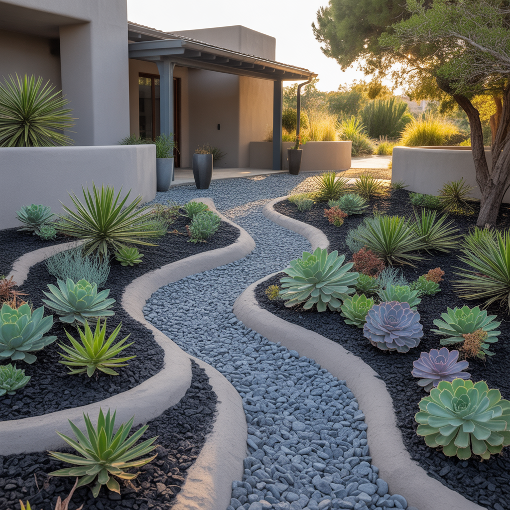 - Modern minimal: monochrome gravel, architectural succulents, clean lines